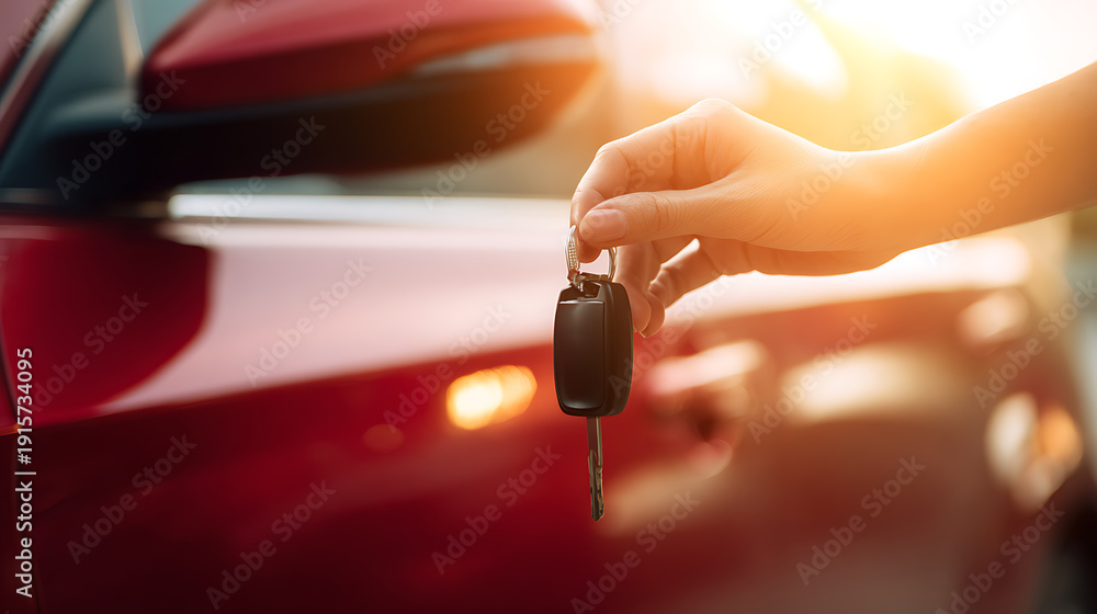 Hand Holds Car Keys with Shiny Red Vehicle in Background and Sunlight Effect, Symbolizing Ownership, Freedom, and New Beginnings #1915734095