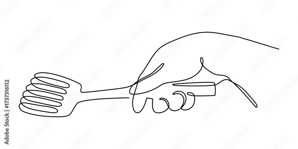 Hand holds kitchen spatula one line art, hand-drawn slotted turner kitchenware continuous drawing contour. Non-stick cookware, chef cooking utensil food preparation home-cooked cuisine. Editable #1737316112