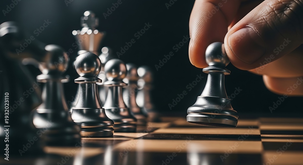 Hand moving metal chess pawn on wooden board with others in focus, black background #1932023110