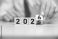 Hand of man flip wooden cube from 2025 to 2026. #1766303427