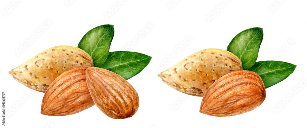 Hand-Painted Watercolor Illustration of Almonds with Green Leaves #1953638707