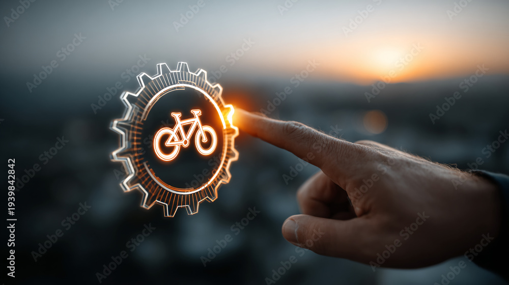 Hand pointing at glowing cycling wheel icon in high rise urban office at sunset, representing momentum based scaling strategy #1939842842