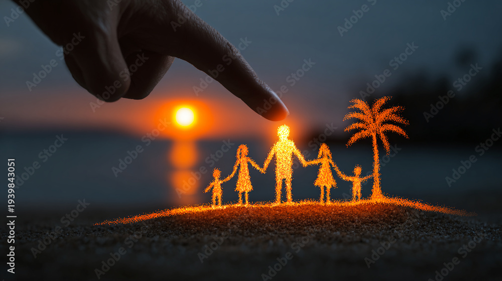 Hand pointing at glowing family travel vacation icon with beach sunset background, representing lifestyle balance and recreation planning strategy #1939843051
