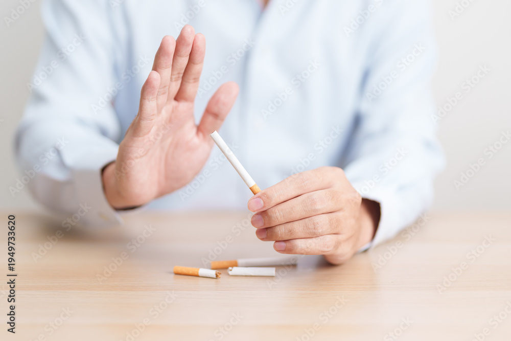 hand refuse to cigarette for World No Tobacco Day concept, quitting smoking to prevent Lung Cancer, COPD, Emphysema and Tuberculosis disease. healthy lifestyle resolution, stop nicotine addiction #1949733620