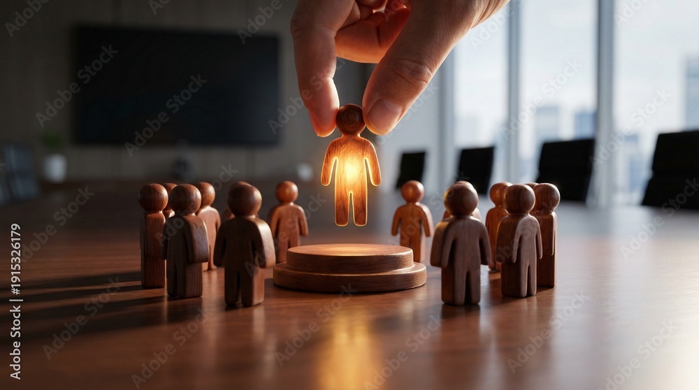 Hand selecting glowing talent for leadership role, distinguishing exceptional individual in corporate setting #1915326179