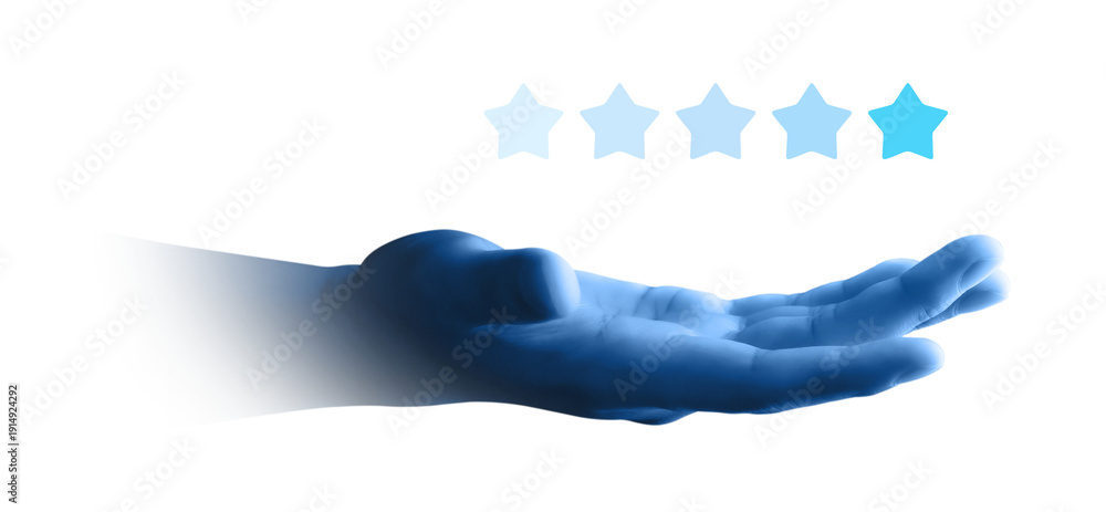 Hand showing five star rating for best quality service review and feedback success #1914924292
