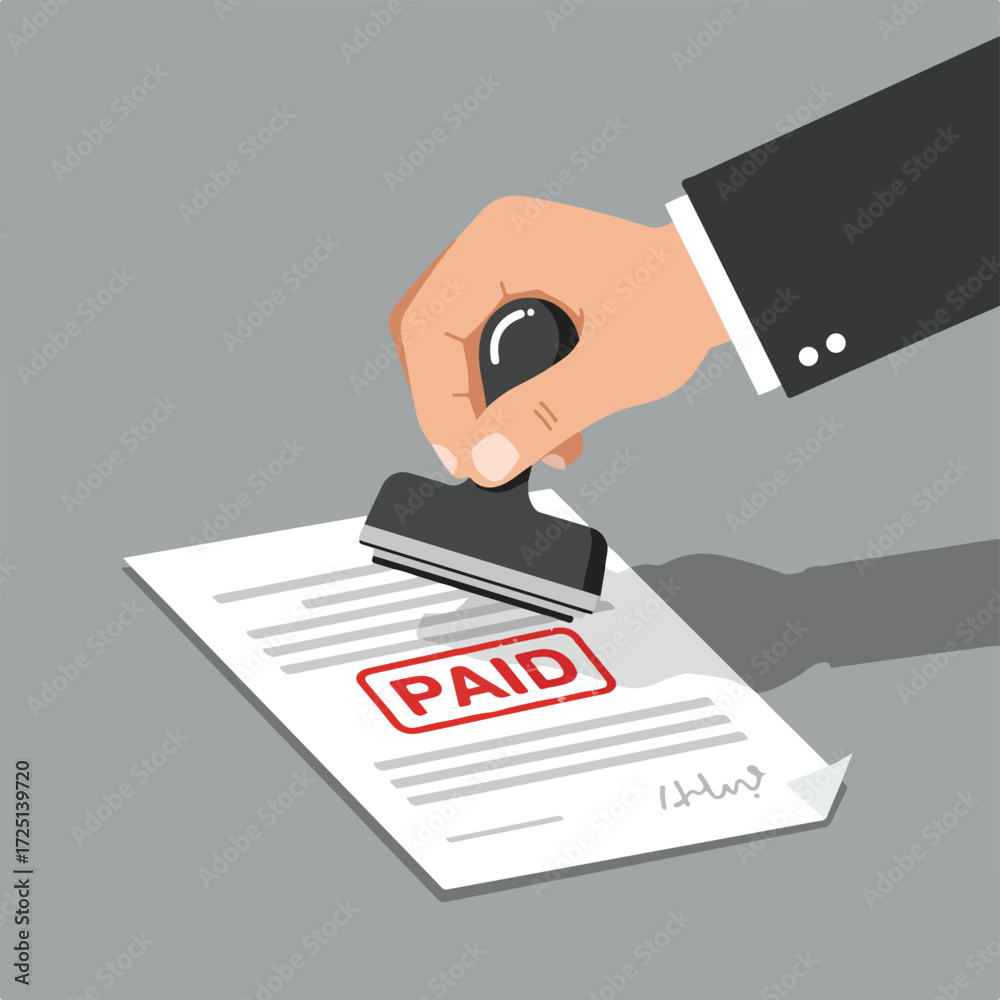 Hand stamps the word "PAID" in red on a document, suit jacket in view #1725139720