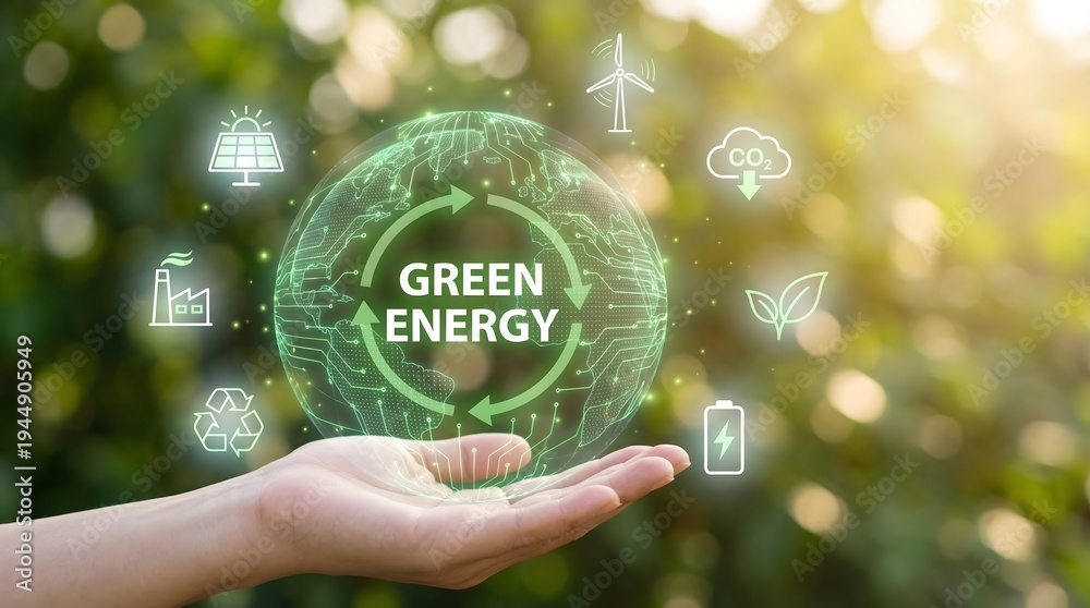 Hand supporting glowing green energy globe with alternative power and recycling icons #1944905949