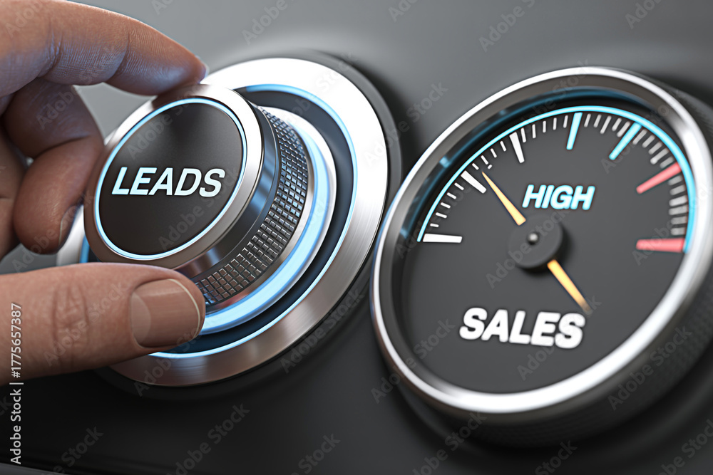 Hand turning a leads dial with a sales gauge showing high performance indicating successful marketing and business growth demonstrating effective lead generation strategies #1775657387