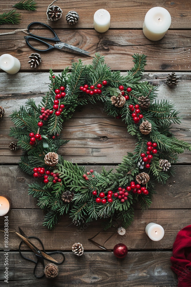 Handcrafted holiday wreath made of pine branches, red berries, and pinecones, surrounded by candles, scissors, and festive decor. #1802583834