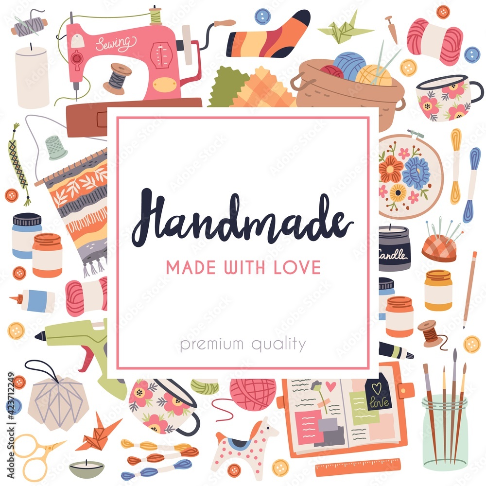 Handmade crafts. Art accessories and materials, hobby tools, cozy creative products. Embroidery, weaving and knitting. Poster for studio or shop. Vector square frame flat cartoon concept #423712249