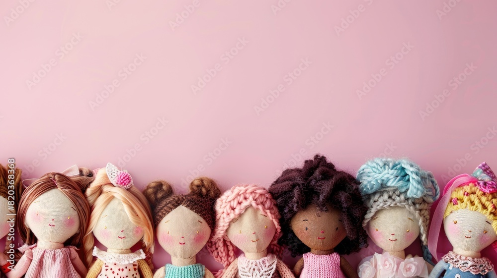 Handmade rag dolls with various hairstyles on pink background #820368368