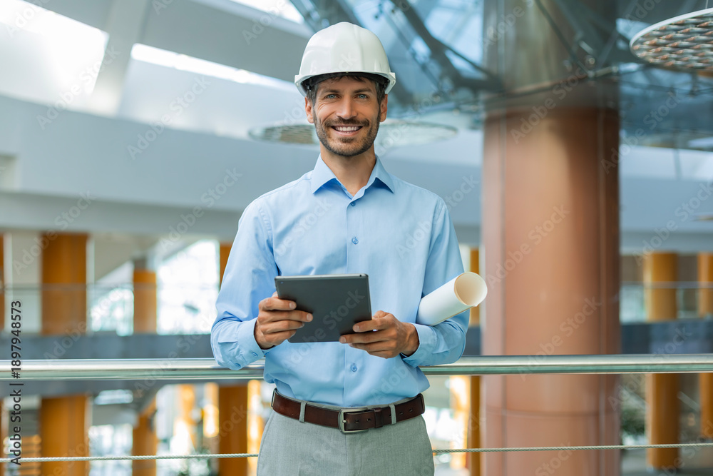 Handosme man with worker's helmet holding digital tablet while looking at camera in building under construction #1897948573