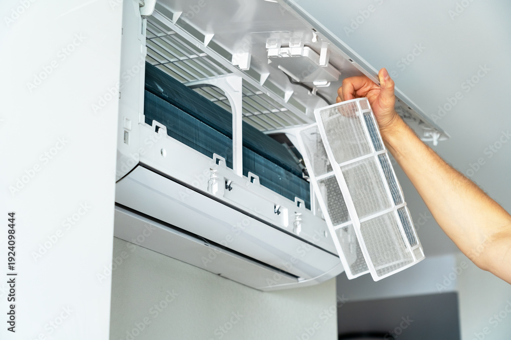Hands changes cleaning filter in air conditioner. Air conditioning maintenance. Purification and repair of cooling system #1924098444