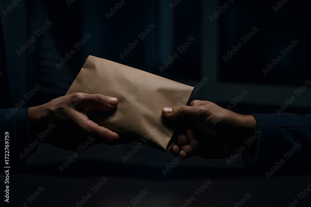 Hands exchanging envelope in dark room showing secret payment concept for corruption bribery illegal transaction financial misconduct concealment business crime hidden money exchange under low light a #1722769759