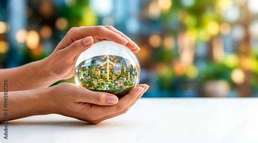 Hands holding a glass globe containing miniature plants and flowers #1965927280