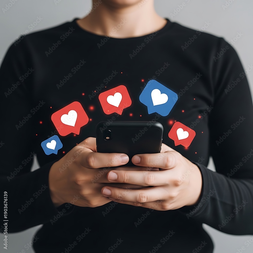 Hands holding a smartphone with social media like and heart icons popping out, representing engagement and online popularity. #1903676139