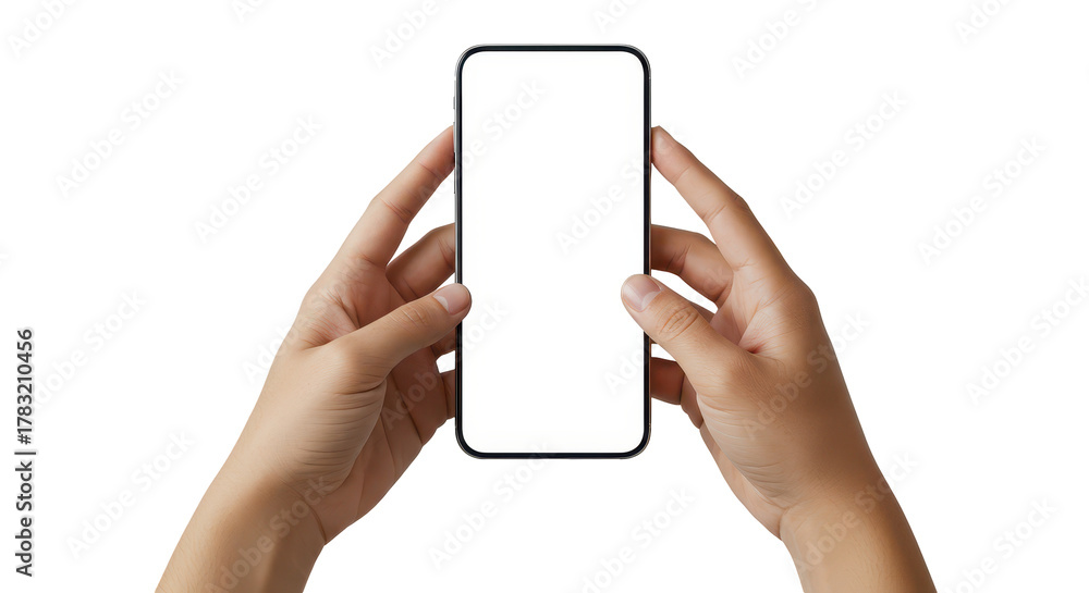 Hands Holding Mobile Phone: A pair of hands delicately cradles a sleek, modern smartphone, offering a blank screen that invites the viewer to imagine endless possibilities. #1783210456