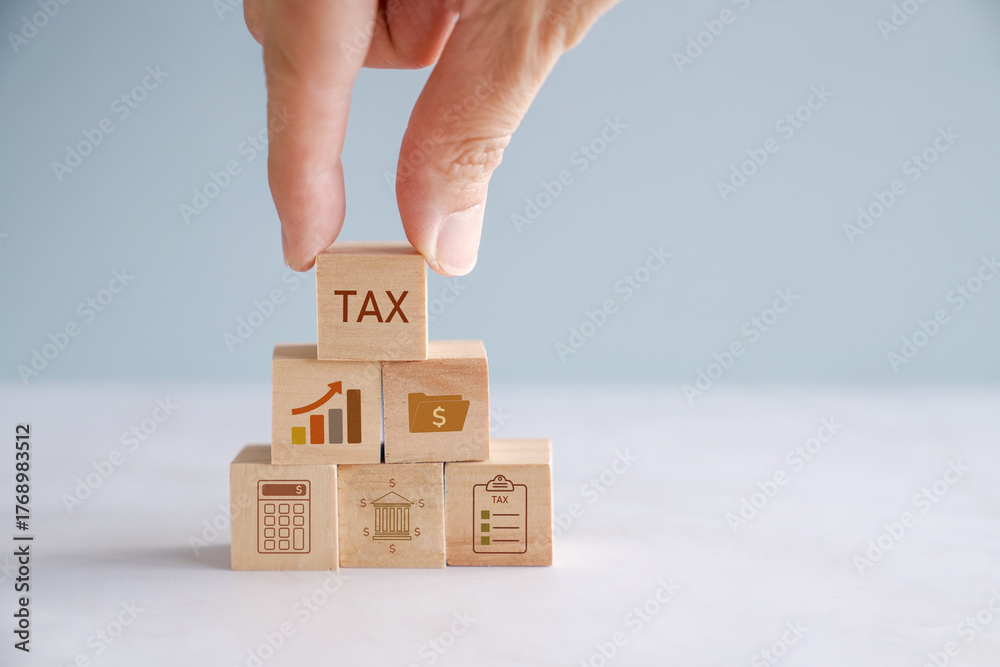 Hands holding wooden blocks with TAX word and icons, end of financial year, business concept #1768983512