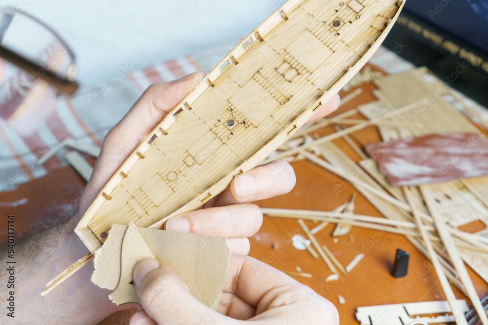 Hands of man adjusts plywood details for ship model, grinding on sandpaper. Process of building toy ship, hobby and handicraft. Table with various materials, parts and devices for work #540117114
