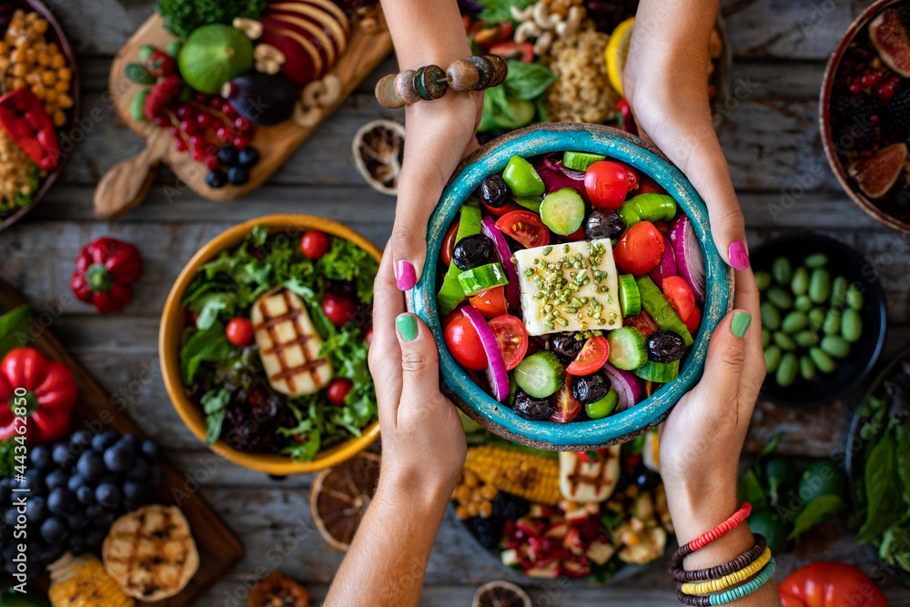 Hands of two women sharing Greek salat at the restaurant table. Health eating concept #443462850