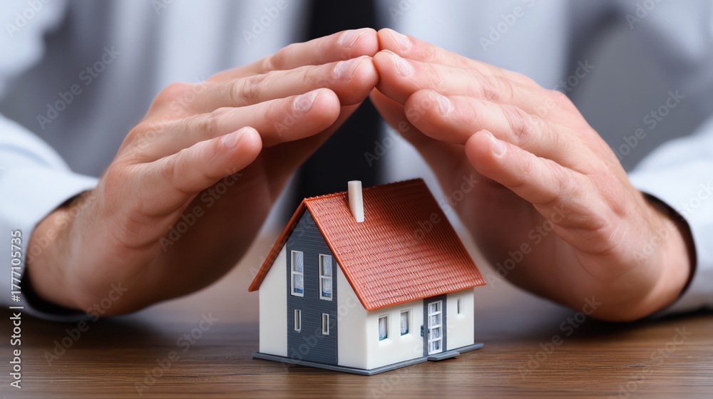 Hands protecting a small model house, symbolizing home insurance and real estate investment. This image captures the concept of safeguarding property and financial security. #1777105735