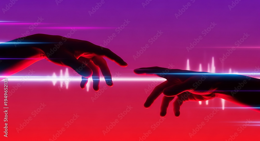 Hands reaching out in a neon-lit environment with purple and red hues #1949652131