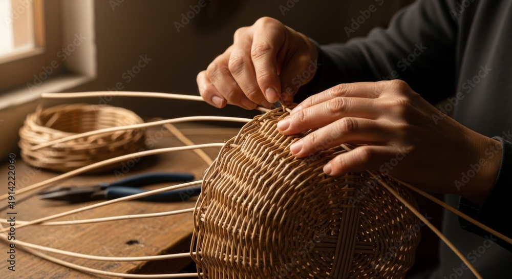 Hands weaving a traditional wicker basket on a wooden table, close-up shot #1914222060