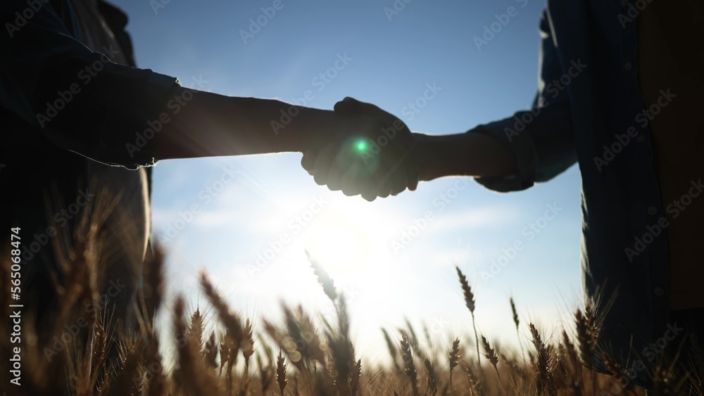 handshake farmer wheat. business partnership agriculture concept. silhouette two farmers shaking hands conclude a contract agreement in a field sun of wheat glare. agriculture handshake concept #565068474