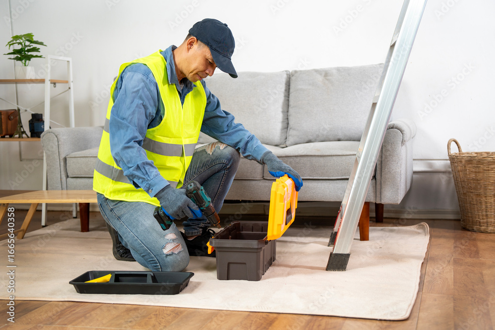 Handyman in Action: An adept handyman in a reflective vest prepares his tools at the ready, embodying the essence of a reliable craftsman. #1665640358