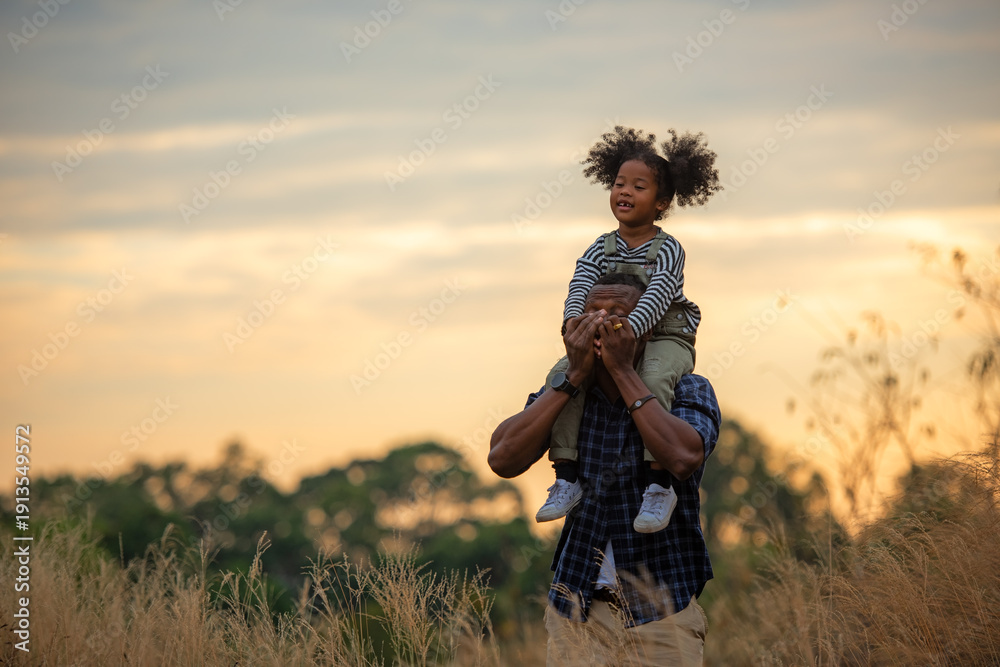 Happy African family child daughter riding the neck father and running on meadow nature on silhouette lights sunset. Travel and Family Concept, copy space #1913549572