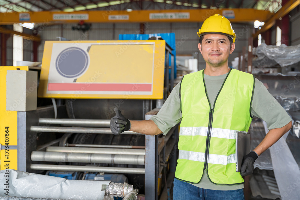Happy Asian engineer in high-vis vest and hard hat giving a positive thumbs-up in front of a heavy industrial roll forming machine. #1773407864