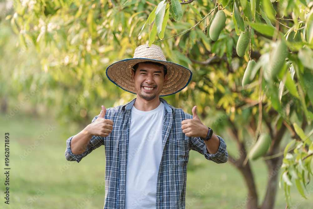 Happy asian farmer thumbs up portrait standing in mango orchard Thailand. showing confidence in local produce quality and sustainable agriculture business success, food security #1962871893
