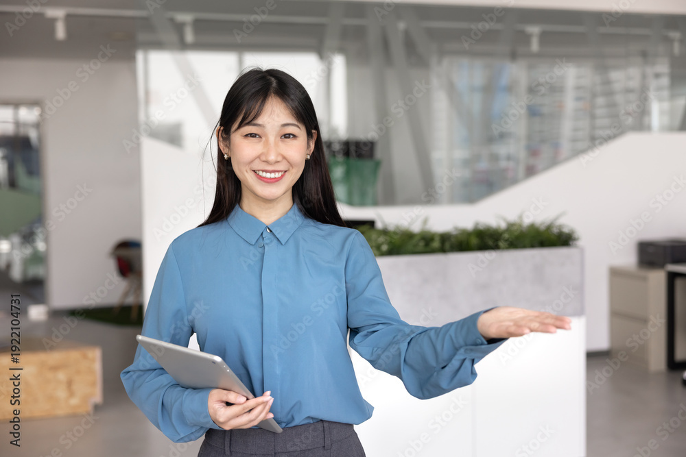 Happy beautiful young Asian business professional girl showing air copy space on hand, posing for advertising template portrait, looking at camera, smiling, holding tablet pc #1922104731