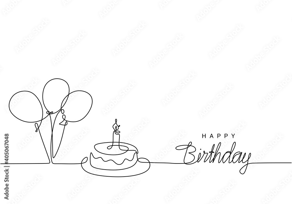 Happy Birthday continuous line drawing, handwritten lettering with symbolic party balloon and birthday cake. One hand drawn minimalist style. #405067048