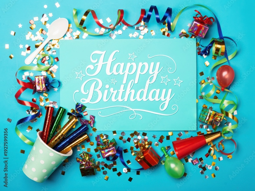 Happy Birthday flat lay party decorations on turquoise background #1927599356