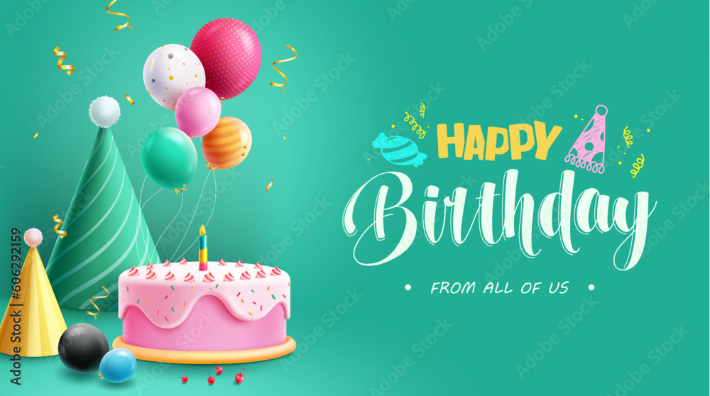 Happy birthday text vector design. Birthday party elements like cake, hat and balloons in pastel color background. Vector illustration greeting card design. #606292159