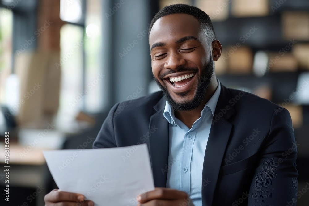Happy businessman celebrating success while reading a letter in his office, reflecting satisfaction and accomplishment after receiving positive news or recognition, Generative AI #1758156355