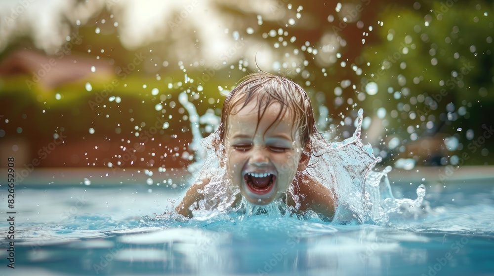 Happy child surfacing from a big splash, enjoying a daring leap into the swimming pool #826652908