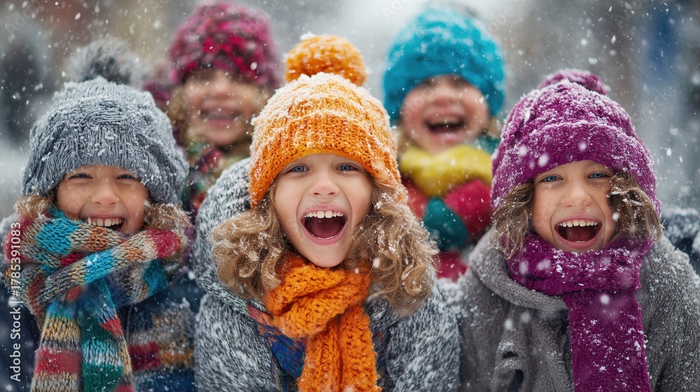 Happy Children Smiling Amidst Snowfall in Colorful Winter Hats and Scarves Outdoors #1785391083