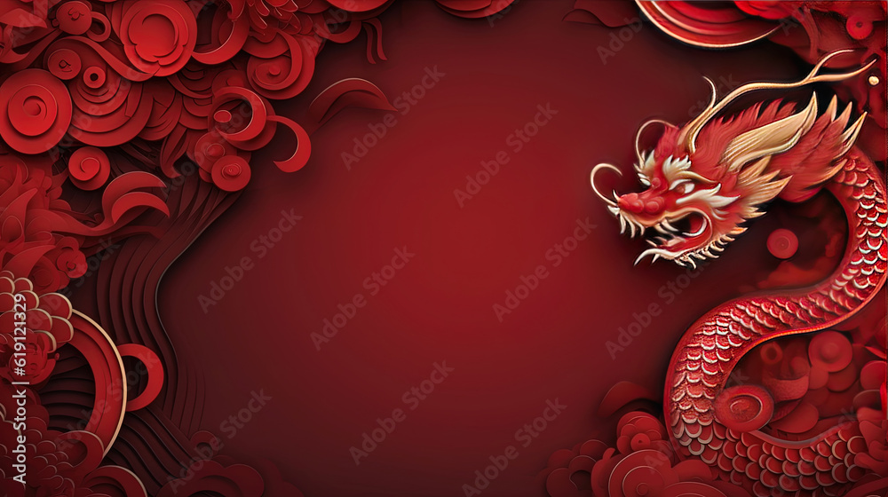 • #619121342 Happy chinese new year, year of the dragon zodiac sign hanging beautiful lantern and flowers on red background. Copy space