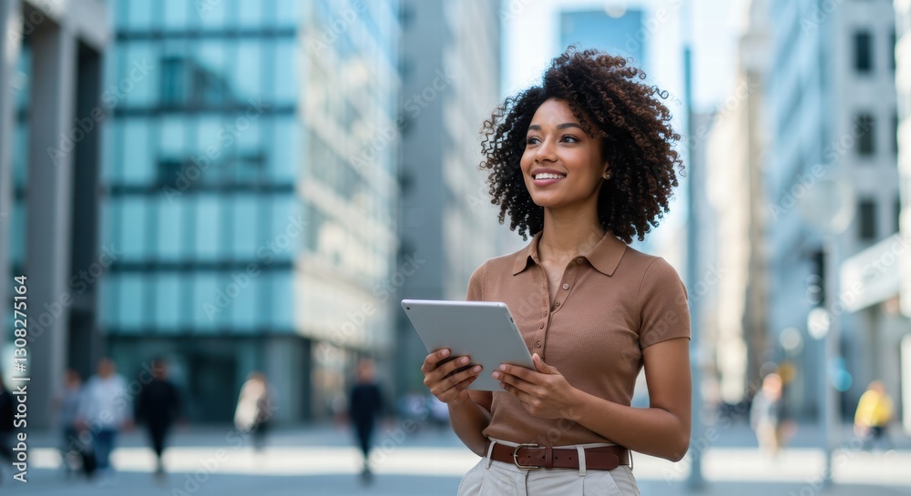 Happy confident young African American professional woman, student, entrepreneur, businesswoman looking away holding tab standing on business city street dreaming of future career. Copy space. #1308275164