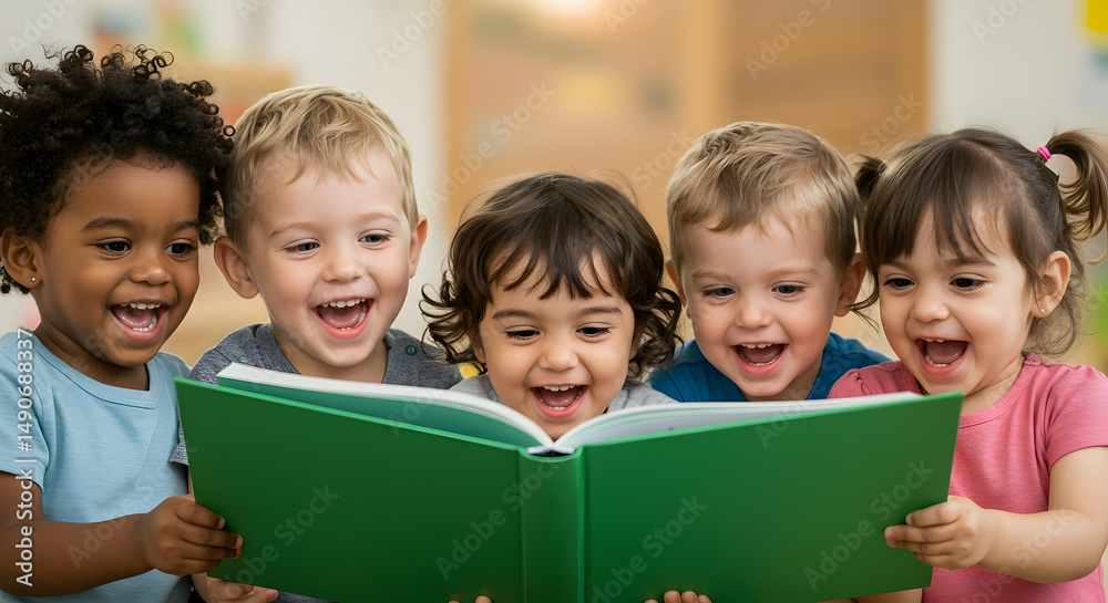 Happy diverse toddlers reading a book together preschool education childhood literacy learning fun kids group joyful reading time storybook early childhood development #1490688337
