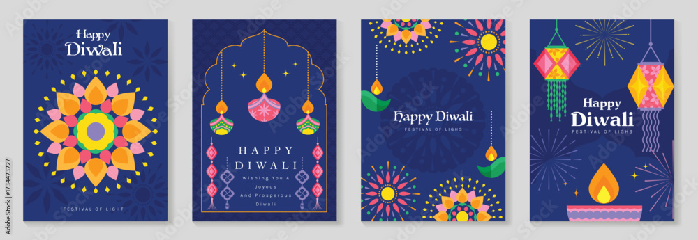 Happy Diwali light festival poster vector set. Diwali festival wallpaper design with colorful lantern, floating lights, firework. Culture Illustration design for celebration, greeting, card, ads. #1734423227