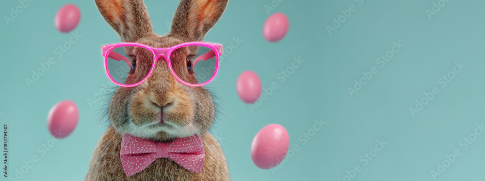 Happy Easter concept, holiday greeting card long banner panorama - Easter bunny, rabbit with sunglasses, bow tie and Easter egg, isolated on blue background #1952794507
