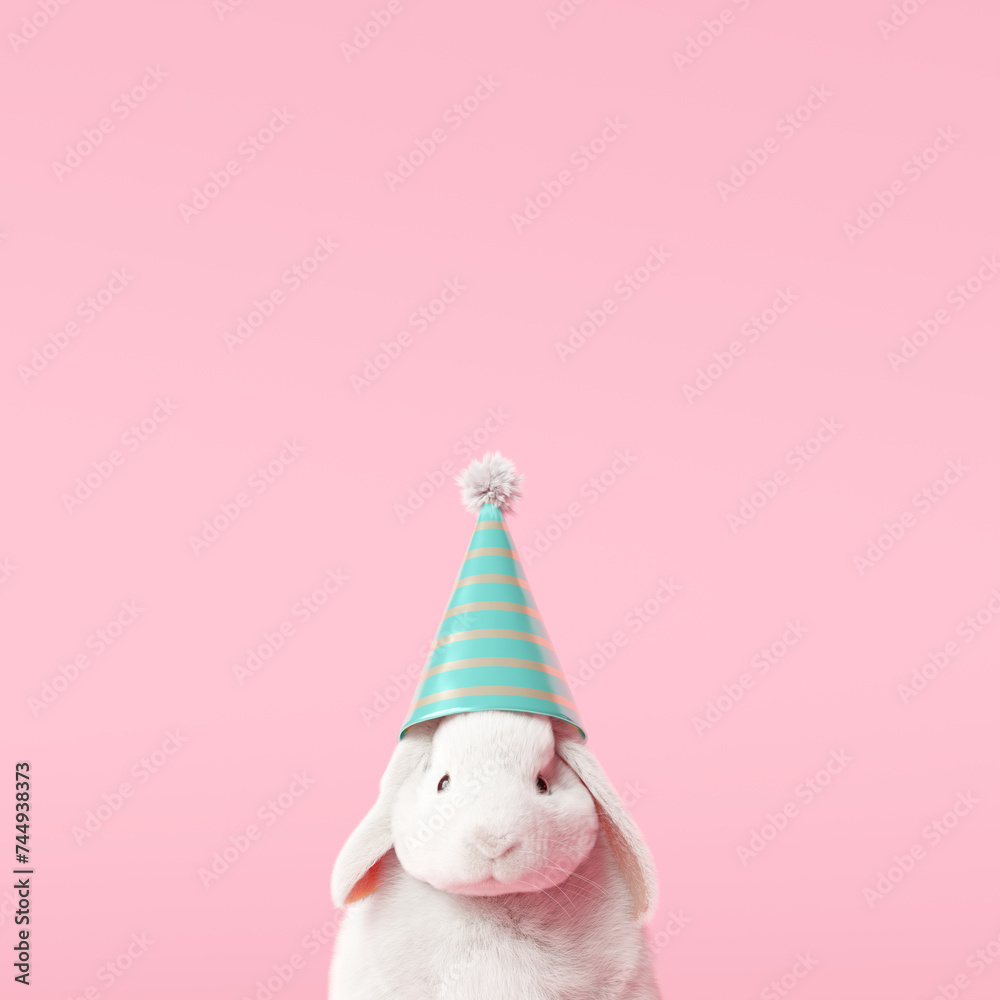 Happy Easter day, bunny with party hat on pastel pink background. 3d rendering #744938373
