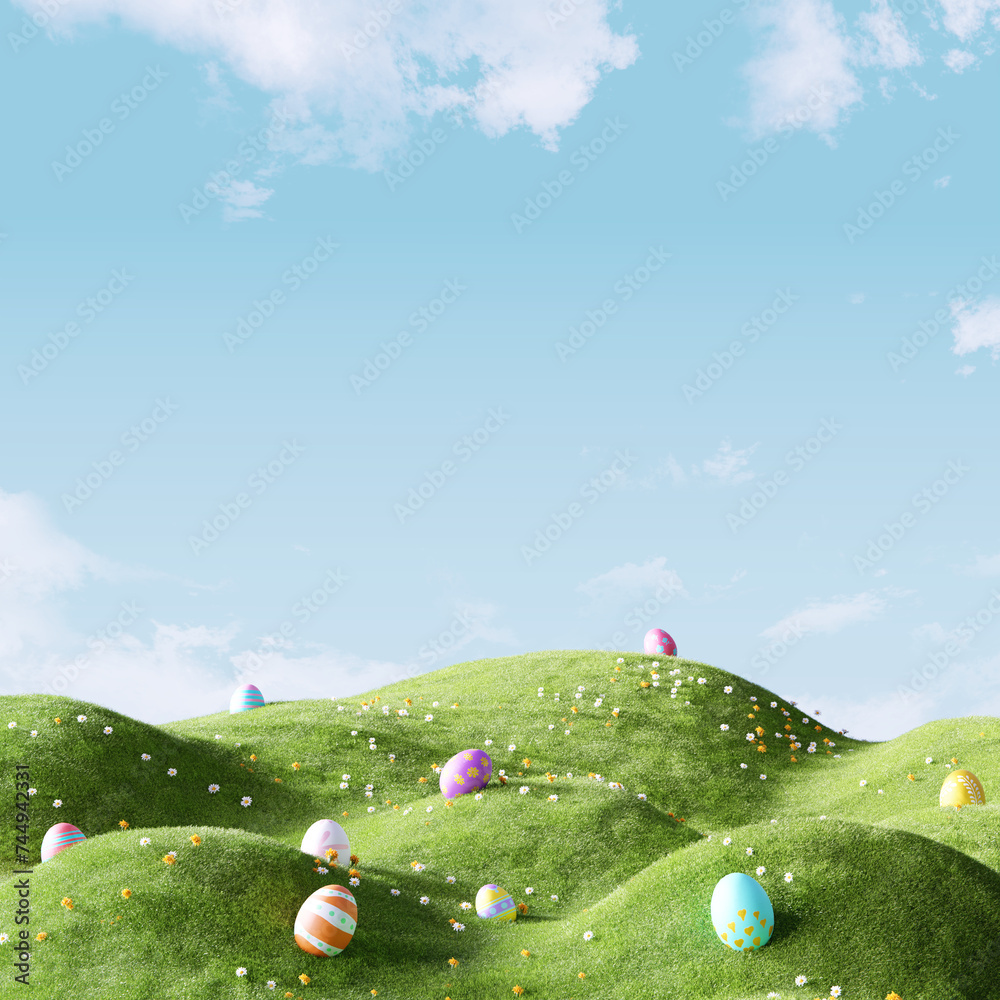 Happy Easter day, colorful eggs and daisy flower on meadow under beautiful sky. 3d rendering #744942331