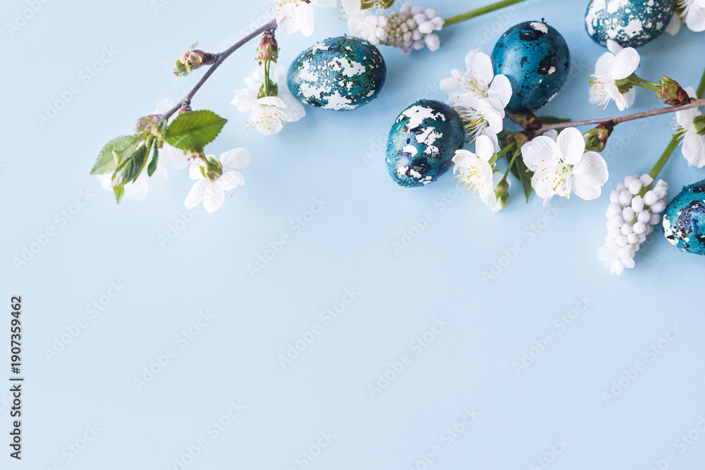 Happy Easter! Easter eggs with cherry blossom flat lay on blue background. Stylish spring template with space for text. Easter greeting card or banner #1907359462