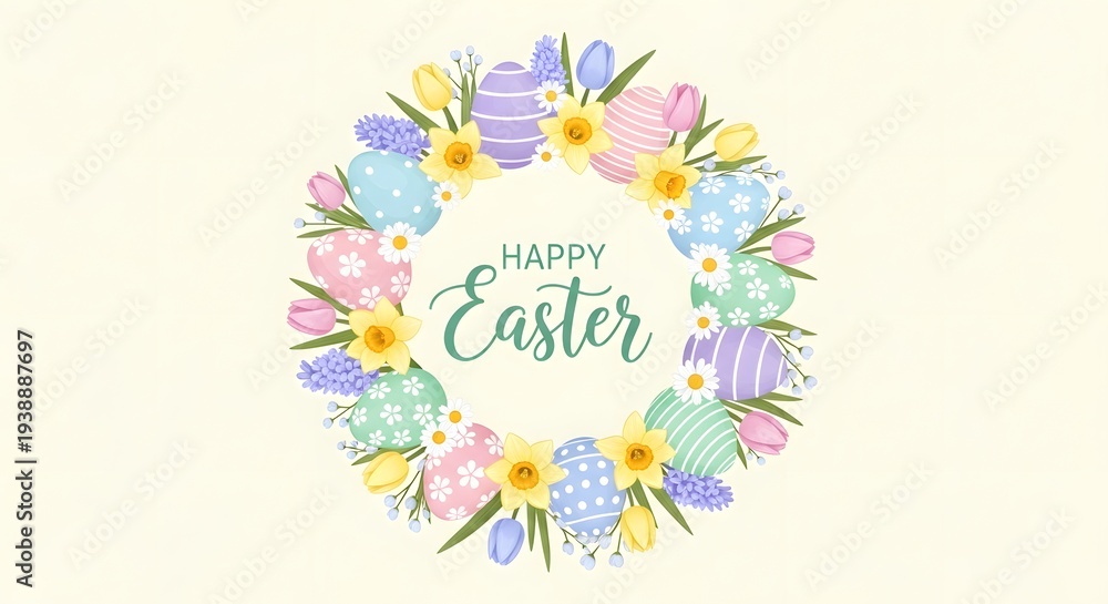 Happy Easter Greeting Card with Floral Wreath and Decorated Eggs on Pale Background #1938887697