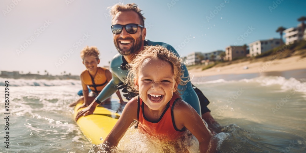 Happy families riding the waves, enjoying collective surfing lessons during a seaside holiday , concept of Community bonding #705727949